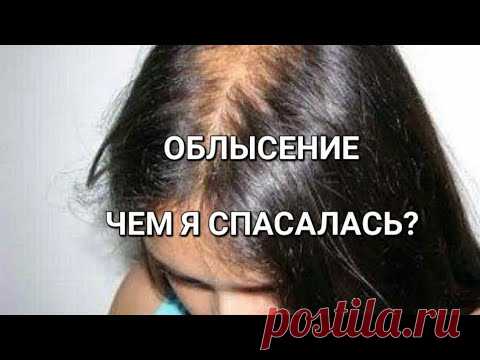 Изображение демонстрирует частичное облысение у женщины с темными волосами, на переднем плане виден текст "Облысение. Чем я спасалась?".