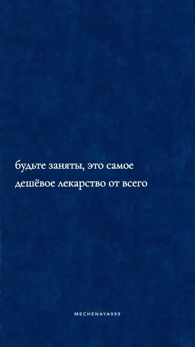Изображение содержит мотивационную фразу на синем фоне: "Будьте заняты, это самое дешёвое лекарство от всего".