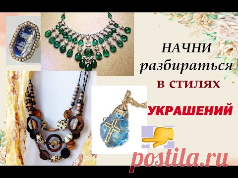 Изображение с различными украшениями, включая ожерелья и кулон, с текстом "Начни разбираться в стилях украшений".