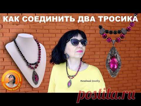 На изображении женщина в солнцезащитных очках и жёлтой одежде. На шее у неё ожерелье с крупными розовыми камнями. На заднем плане кирпичная стена. Слева от женщины манекен с подобным ожерельем. Наверху надпись: "Как соединить два тросика".