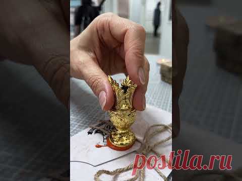 Рука держит декоративную золотую печать на белом листе бумаги с веревкой и красным воском.