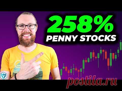 На изображении человек с бородой в желтой футболке улыбается и указывает пальцем. Позади него текст: "258% PENNY STOCKS". Справа изображены графики свечей, символизирующие рост акций.