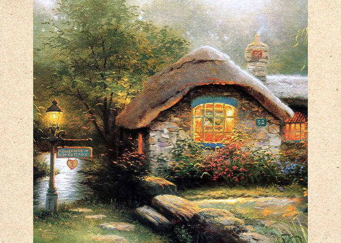 Живописное изображение каменного коттеджа с соломенной крышей, окруженного зеленью и цветами. На переднем плане видна дорожка и фонарный столб.