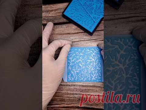 Изображение показывает руки в перчатках, которые держат синий трафарет с узором на деревянной поверхности.