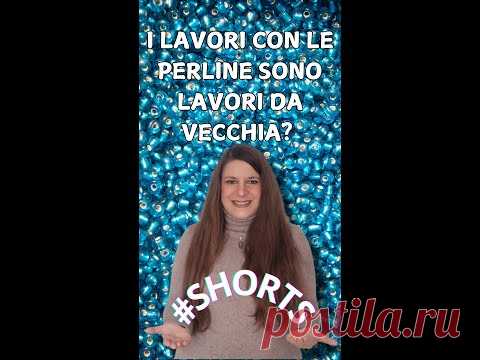Изображение женщины на фоне голубых бусин с текстом об увлечении бисероплетением. Текст на итальянском гласит: "I lavori con le perline sono lavori da vecchia?" и содержит хэштег "#SHORTS".