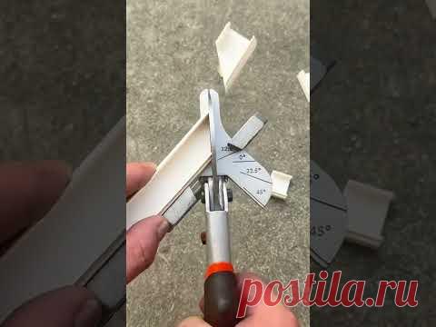 Человек использует угловой резак, чтобы отрезать пластиковый профиль по определённому углу.