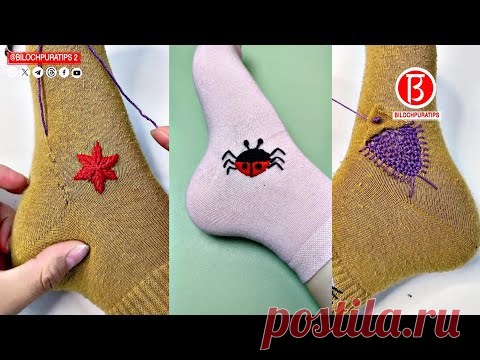 Изображение показывает три носка с вышивкой: красная звезда, черный паук и фиолетовый узор.