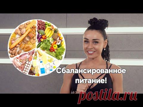 На изображении женщина стоит рядом с графиком, иллюстрирующим различные группы продуктов питания для сбалансированного питания. Надпись гласит: "Сбалансированное питание!".