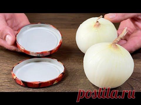 На изображении показаны две луковицы и две крышки для консервных банок на деревянной поверхности.