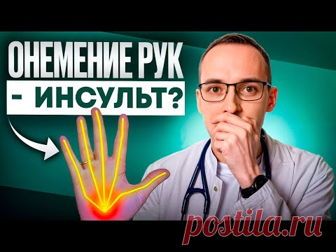 Это изображение содержит текст на русском языке: "Онемение рук - инсульт?". На картинке изображен человек в очках с врачебным стетоскопом на шее, держащий руку у лица. Рядом изображена рука с выделенным нервом, указывающая на потенциальную медицинскую тему.