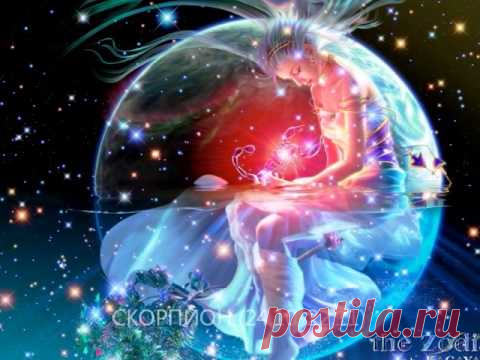 Изображение показывает девушку в форме знака зодиака Скорпион. Она сидит в окружении магического сияния и звезд, создавая волшебную атмосферу.