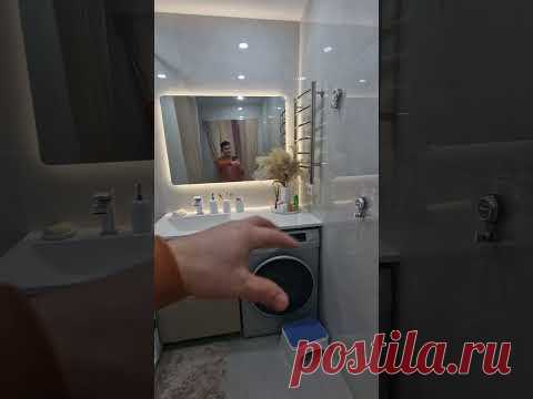 На изображении ванная комната с зеркалом, стиральной машиной и умывальником. На раковине расположены различные туалетные принадлежности, а также видно отражение человека в зеркале.