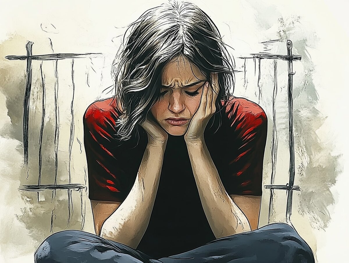 Иллюстрация человека с грустным выражением лица, сидящего со скрещенными ногами и подпертыми руками головой.