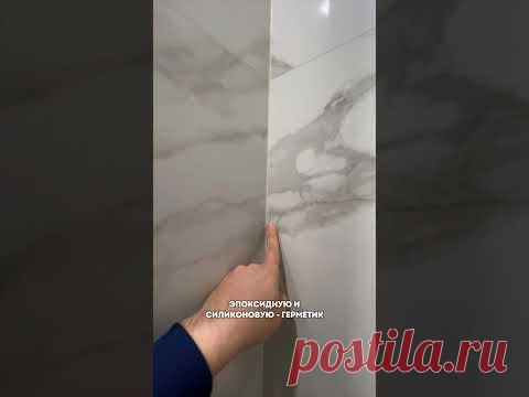 Изображение показывает человека, указывающего на шов между кафельными плитками. На изображении также присутствует текст, который, вероятно, относится к герметику.