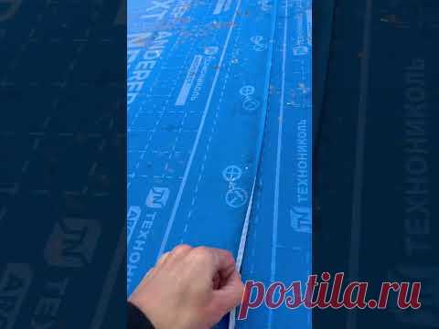 На изображении рука человека, держащая и показывающая рулон синего строительного материала с логотипом и текстом на пленке.
