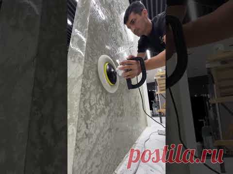 Человек полирует мраморную стену при помощи шлифовальной машины в помещении.