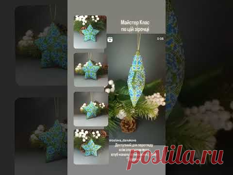 Изображение мастер-класса по изготовлению рукодельных новогодних украшений в форме звезды и капли, декорированных синими и зелеными узорами. Украшения подвешены на елочных ветках.