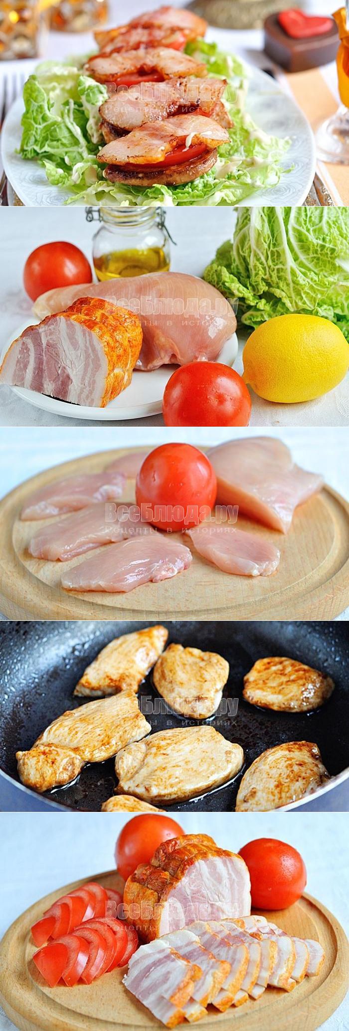 Салат с беконом, помидорами и куриным филе, рецепт с фото