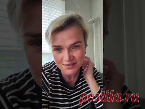 Женщина в полосатой футболке смотрит в камеру. Фон включает окно с жалюзи и лампу.