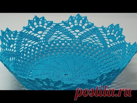 На изображении представлена вязаная крючком корзина бирюзового цвета с ажурным узором.
