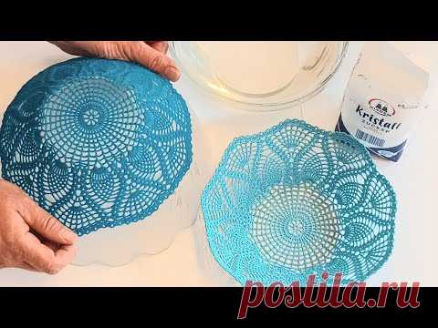 Изображение показывает два вязаных салфетки, одна из которых используется для формирования формы вокруг миски. Рядом находится упаковка клея для текстиля.