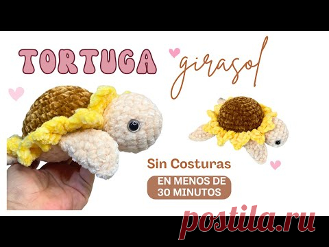 Изображение инструкции по созданию вязаной игрушки черепахи "подсолнух" с использованием крючка без швов. Утверждается, что изделие можно сделать за 30 минут.