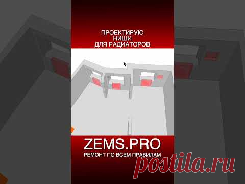 Изображение содержит рекламный макет фирмы ZEMS.PRO, специализирующейся на проектировании ниш для радиаторов. На изображении показан план комнаты с нишами для радиаторов.