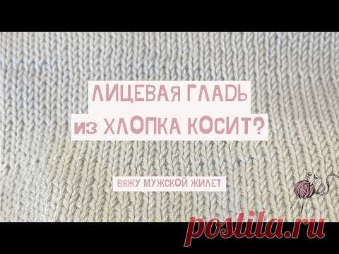 Изображение с текстом: "Лицевая гладь из хлопка косит? Вяжу мужской жилет". На фоне показан образец вязания.