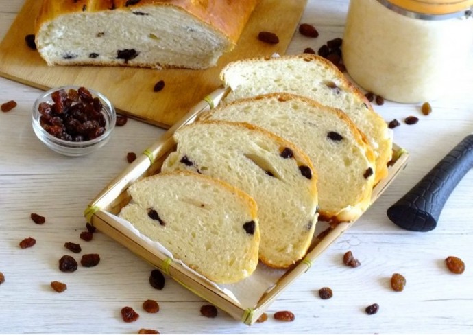 Дрожжи прессованные — 13 гМолоко — 250 млСахар — 4 ст. л. Соль — 1 щепотка Масло растительное — 4 ст. л. Изюм — 50 г Мука пшеничная — 450–500 гПриготовление:1. В теплом молоке растворите дрожжи и сахар. Оставьте...