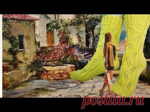 Коллаж с женщиной, стоящей перед огромными зелеными вязанными носками на фоне живописного деревенского пейзажа с домами и растениями.