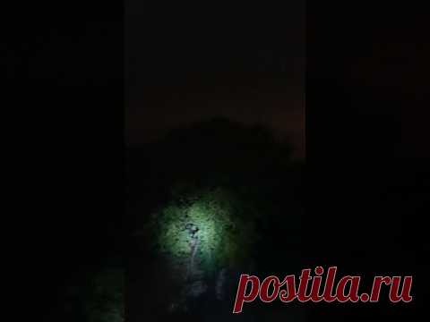 Темное изображение с едва различимой листвой, освещенной фонарём.