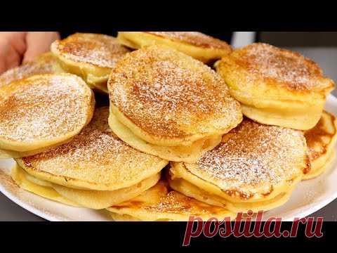 Блюдо из оладий с сахарной пудрой на тарелке.