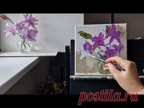 Изображение показывает процесс рисования натюрморта с цветами. В левой части фотографии стоит ваза с розовыми цветами на подоконнике. Справа человек рисует кистью на холсте, изображая эти цветы.
