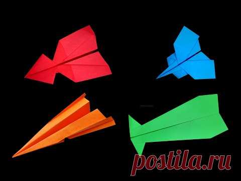 Изображение содержит четыре бумажных самолётика: красный, синий, оранжевый и зелёный на чёрном фоне.