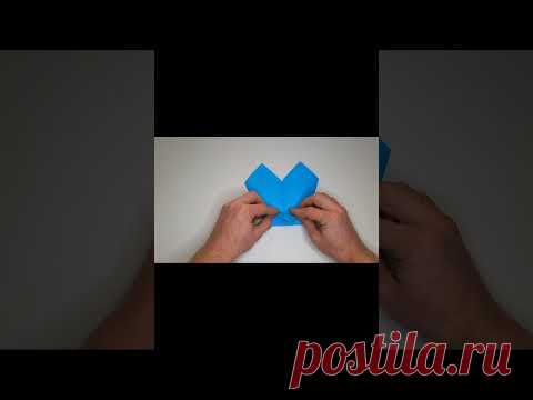 На изображении показан процесс складывания бумаги в технике оригами, где руки держат сложенный лист синей бумаги.