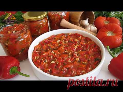 На изображении показаны банки с консервированным лечо, традиционным блюдом из болгарского перца, нарезанного помидора и чеснока. В центре находится большая тарелка с лечо, окруженная свежими овощами.