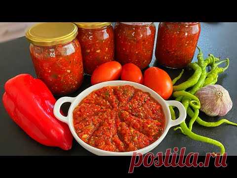 Изображение показывает ряд банок с домашней аджикой, рядом лежат свежие овощи: красный болгарский перец, помидоры, зеленые перцы и чеснок.