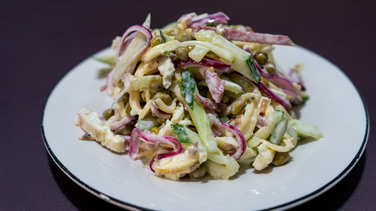 Салат Шустрик | Альтернатива салату Оливье РЕЦЕПТ:Огурец свежий - 300 г. (1-2 шт)Горошек консервированный - 1 банкаЛук красный - 1 шт.Сыр - 200 г.Колбаса полусухая - 200 г.Яйцо - 3 шт.Молоко - 50 мл.Соль - по вкусуМасло растительное - 30 г.Сметана (густая) - 3 ст.л.Майонез - 3 ст.л.Горчица зернистая - 1 ч.л.Горчица острая - 1/2...