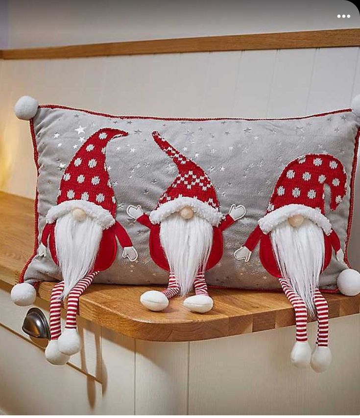 На изображении подушка с декоративными фигурками гномов в красных шапках и с длинными белыми бородами.