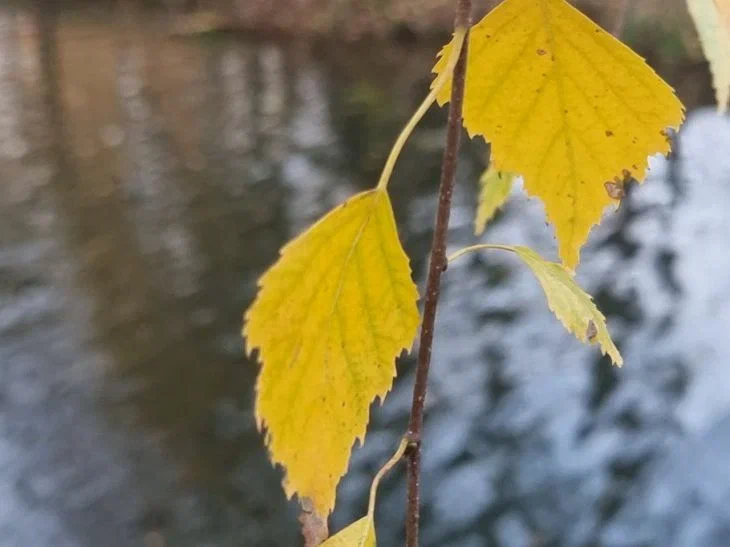 Жёлтые листья на ветке на фоне размытой воды.