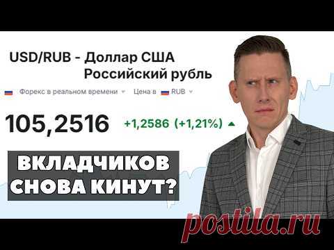 Изображение показывает курс валют, доллар США к российскому рублю (105,2516), и вопрос "Вкладчиков снова кинут?". Видно выражение лица мужчины в деловом костюме.