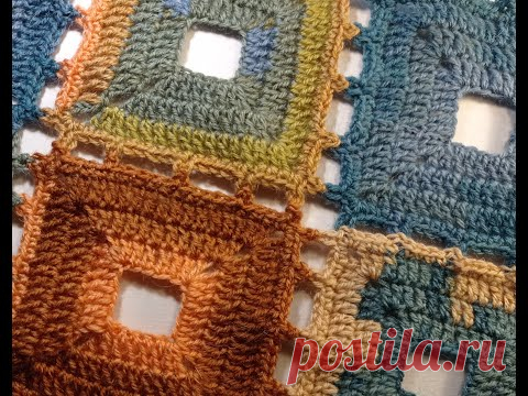 На изображении связанное крючком покрывало с квадратными узорами различных цветов, таких как синий, зелёный и оранжевый.