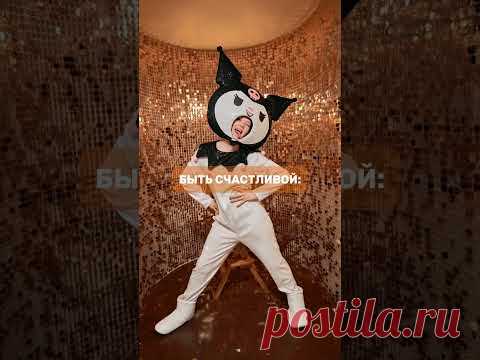 Изображение человека в костюме с большой головной маской на фоне сверкающей стены. Надпись на картинке гласит: "Быть счастливой".