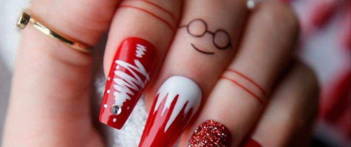 Креативный маникюр с красными и белыми узорами, а также рисунком в виде очков и шрама на пальце.