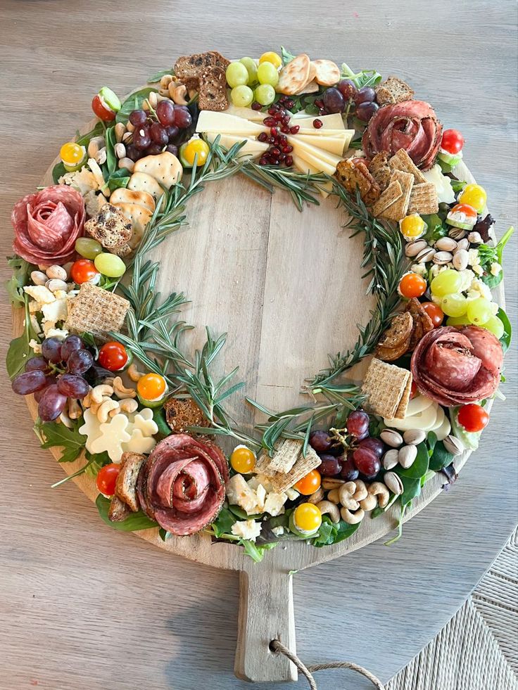 Изображение сырной доски в виде венка. На доске находятся различные продукты, такие как сыр, виноград, крекеры, орехи и нарезки колбасы. Центр венка оставлен пустым, а по краю украшен свежей зеленью.