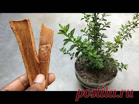 На изображении показаны две палочки корицы в руке человека, а на заднем плане — растение в горшке.