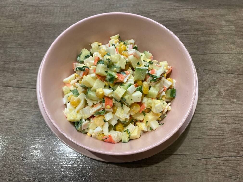 На изображении салат из свежих овощей и крабовых палочек в розовой тарелке.