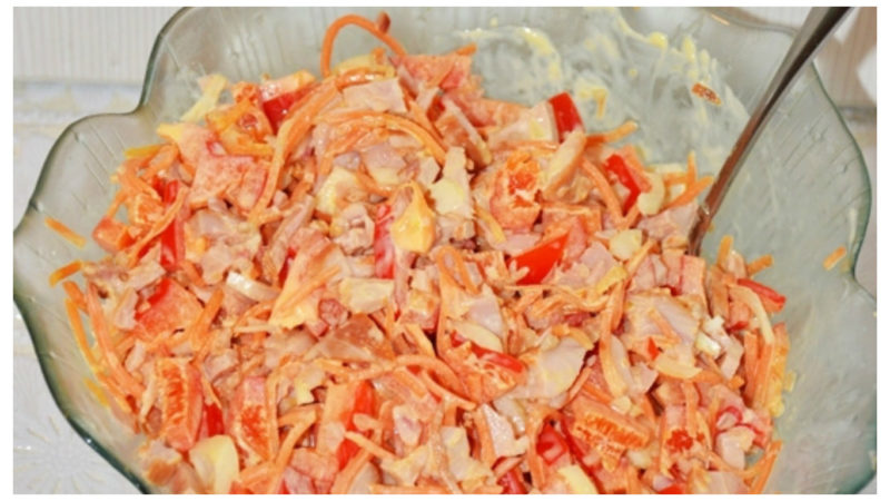 Салат с ингредиентами, такими как морковь, лук, мясо и майонез. Все тщательно перемешано и готово к подаче.