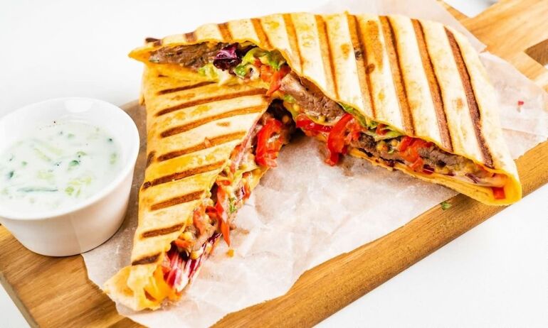 На изображении показан сэндвич-люля на гриле с овощами, который подается на деревянной доске, рядом с соусом в маленькой миске.