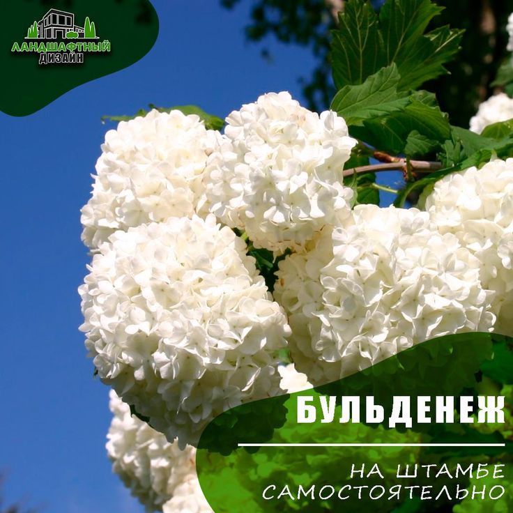 Изображение белых соцветий калины бульденеж на фоне голубого неба.